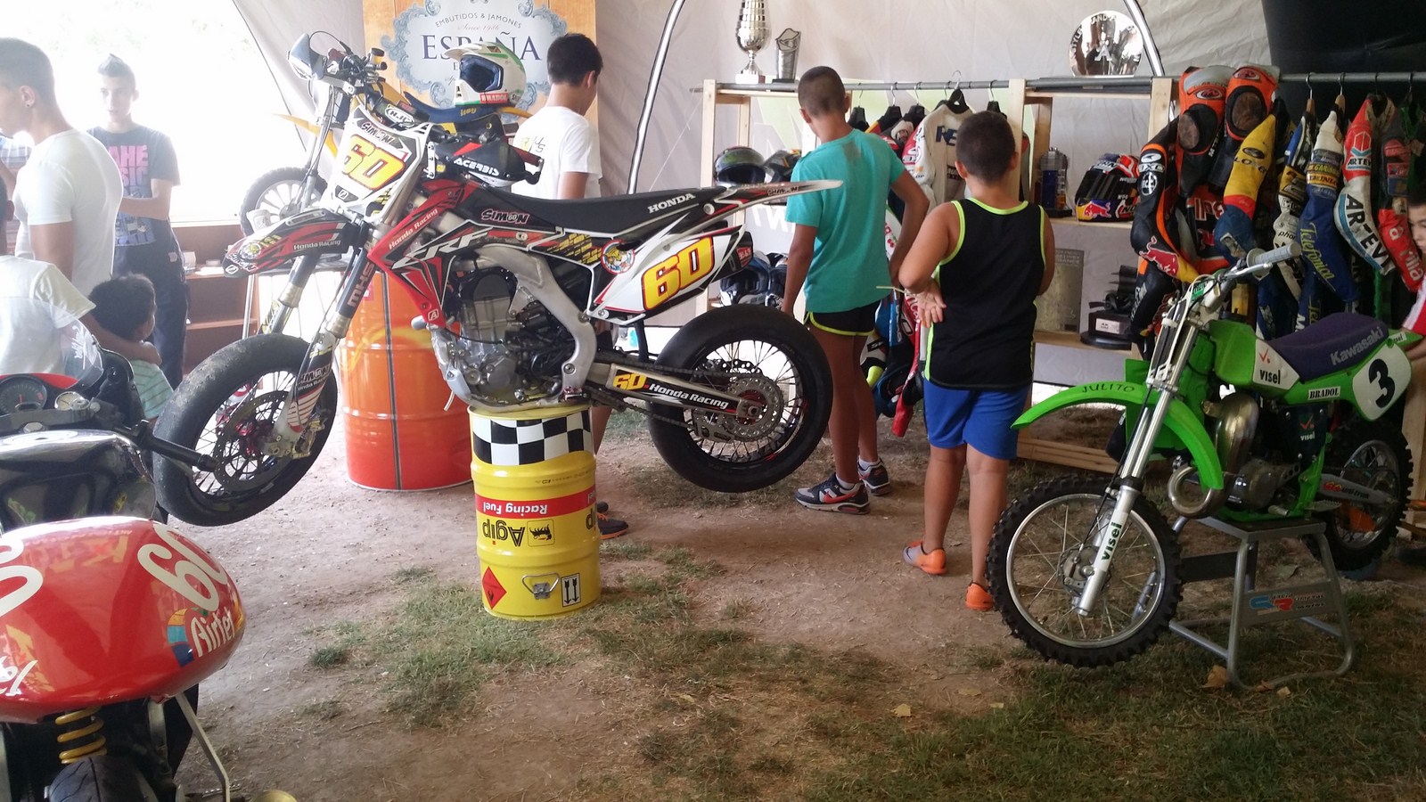 Poco después nos acercamos al stand de Km Xtra, donde estaban expuestas todas las motos y trofeos de Julián Simón, gran piloto y parte organizativa de este gran evento. Estuvimos un largo tiempo hablando con los compañeros de Km Xtra sobre las carreras y pilotos ya que ellos también unos grandes amantes del motor. Nos mostraron su fantástico producto para los pinchazos, que sin duda sería un buen complemento para los MVracing.